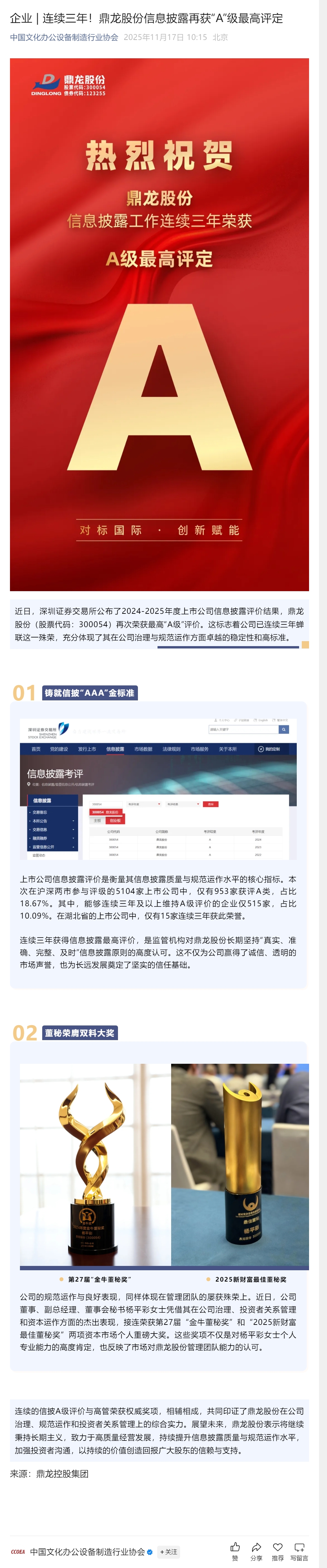 >> 连续三年!鼎龙股份信息披露再获“A”级最高评定