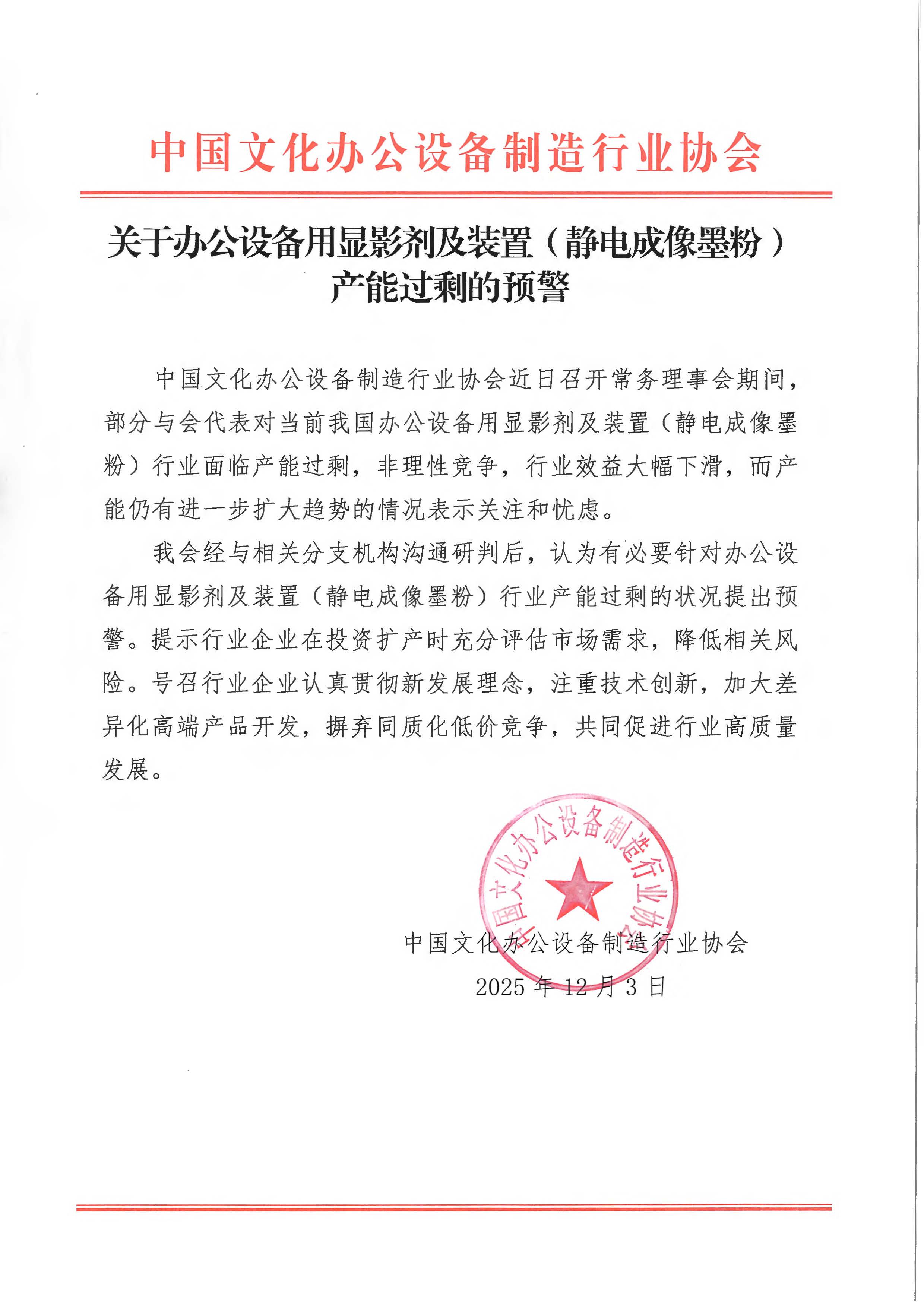 我会经与相关分支机构沟通研判后,认为有必要针对办公设备用显影剂及装置(静电成像墨粉)行业产能过剩的状况提出预警。提示行业企业在投资扩产时充分评估市场需求,降低相关风险。号召行业企业认真贯彻新发展理念,注重技术创新,加大差异化高端产品开发,摒弃同质化低价竞争,共同促进行业高质量发展。
