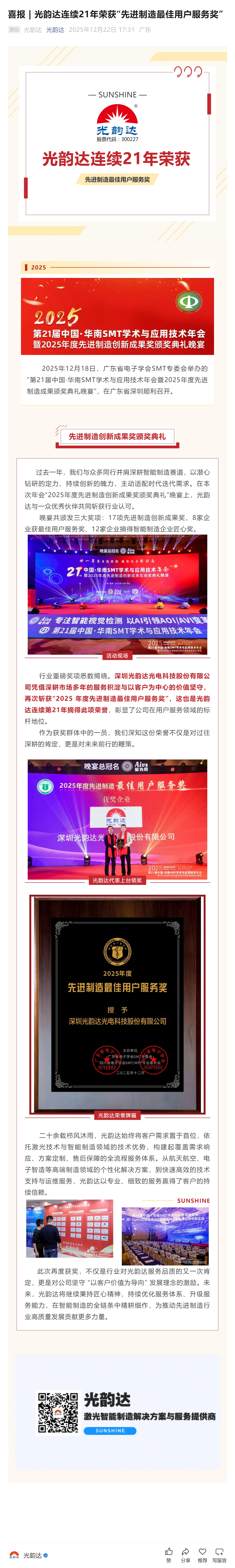 >> 喜报 光韵达连续21年荣获“先进制造最佳用户服务奖”