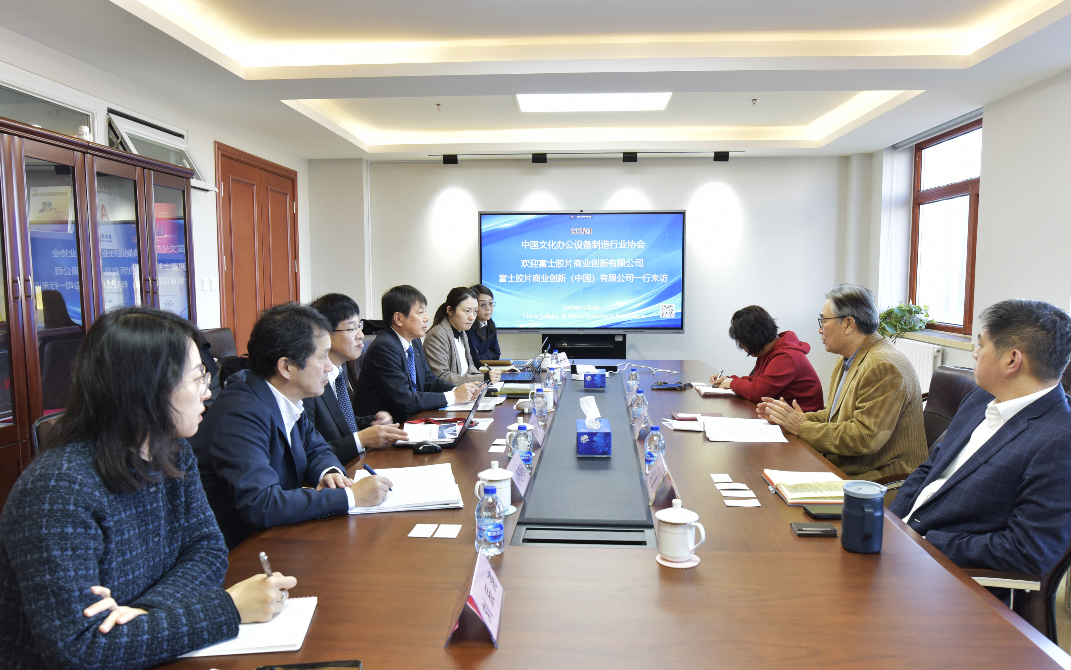 2025年12月4日,焦延和理事长会见了富士胶片商业创新有限公司役员藤田尚寿先生及富士胶片商业创新(中国)有限公司标准和认证高级经理祝晴女士等一行六人,对其到访表示热烈的欢迎。参加会见的有秘书长赵直和副秘书长冷欣新。
