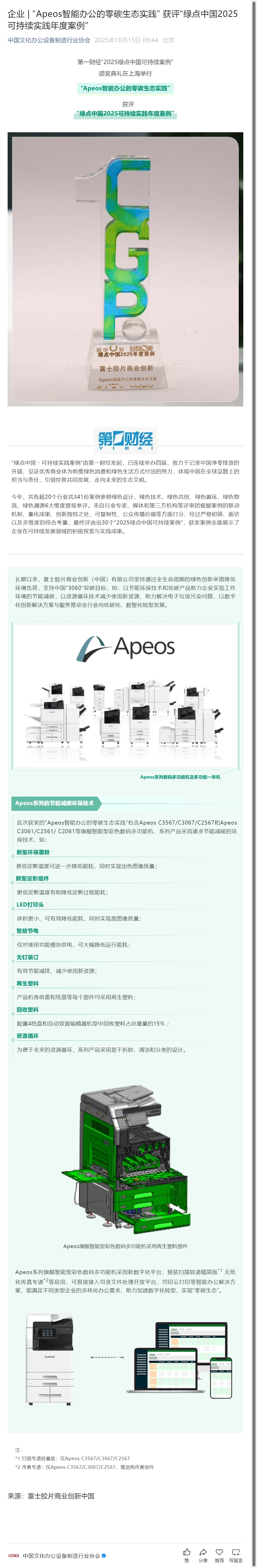 >> “Apeos智能办公的零碳生态实践” 获评“绿点中国2025可持续实践年度案例”