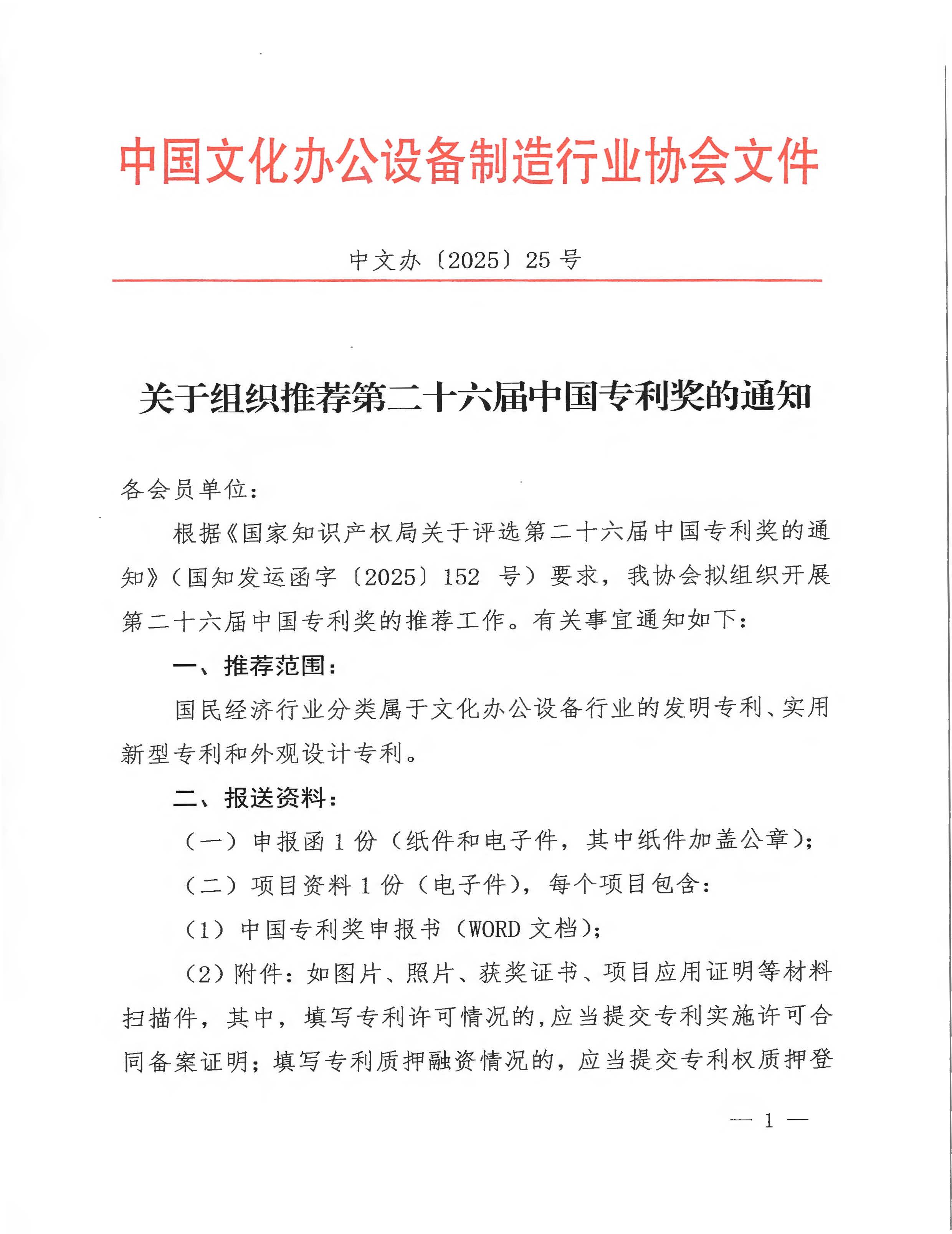 >> 中国文办协会关于组织推荐第二十六届中国专利奖的通知