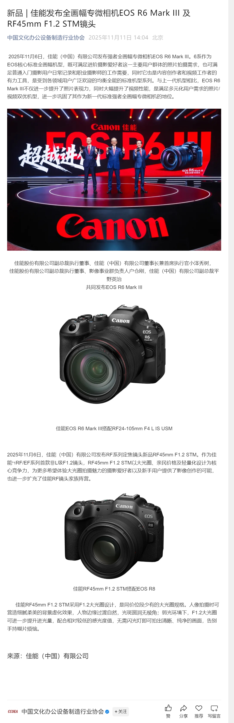 >> 佳能发布全画幅专微相机EOS R6 Mark III 及 RF45mm F1.2