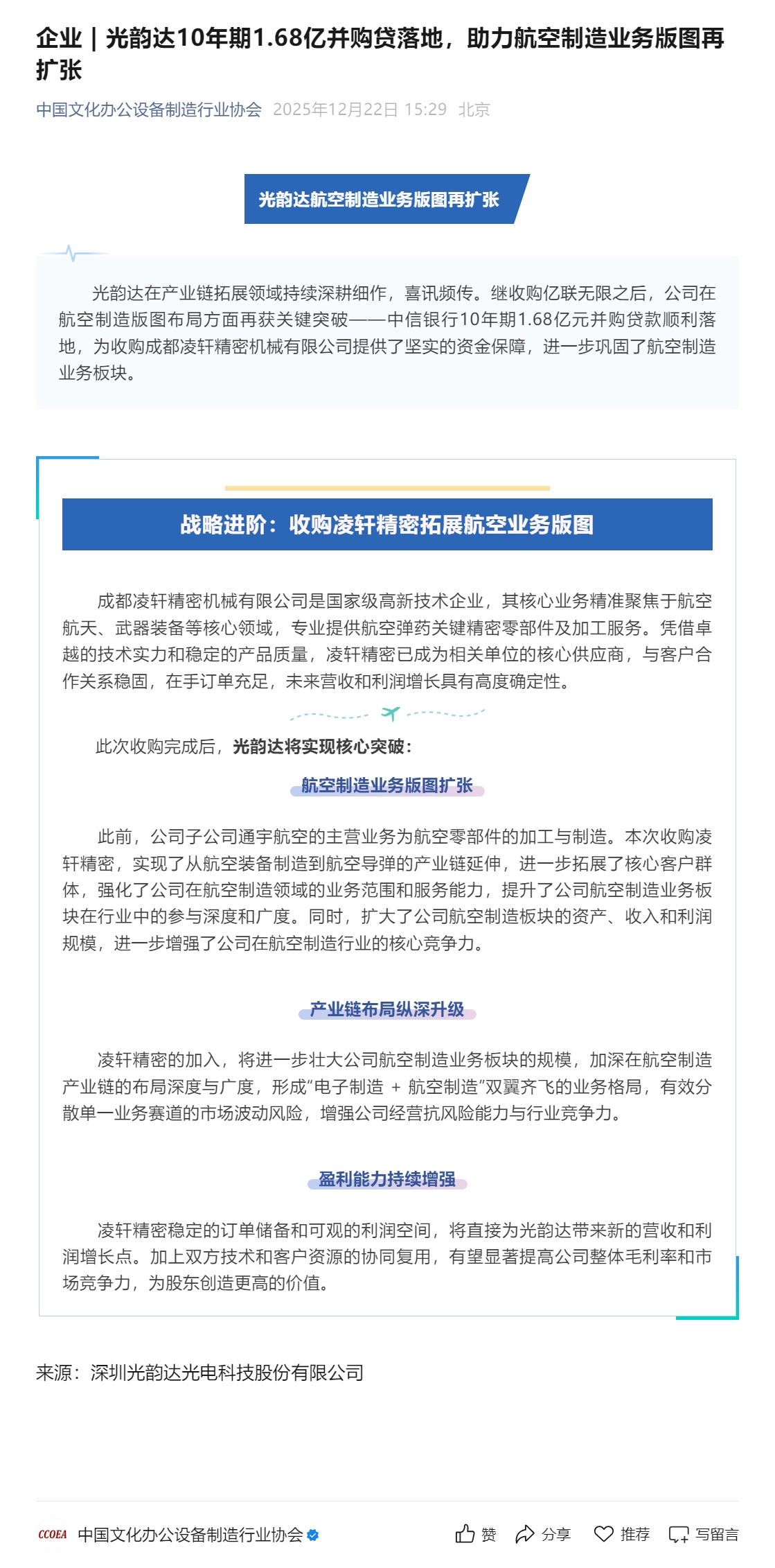 >> 光韵达10年期1.68亿并购贷落地,助力航空制造业务版图再扩张