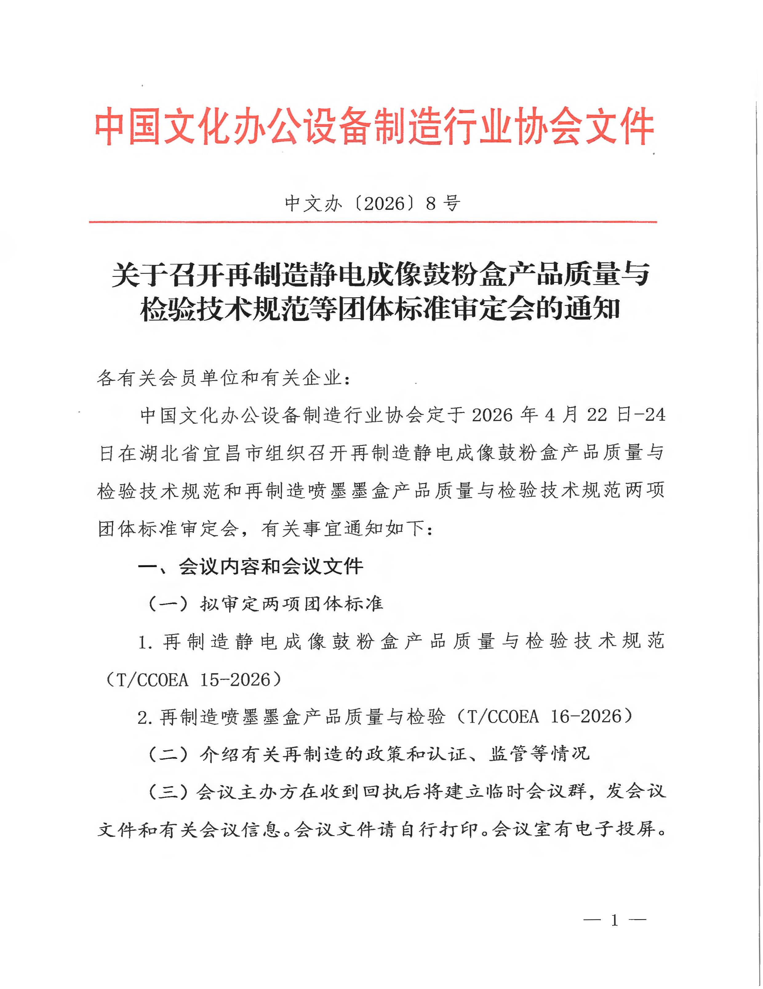 >> 关于召开再制造静电成像鼓粉盒产品质量与检验技术规范等团体标准审定会的通知
