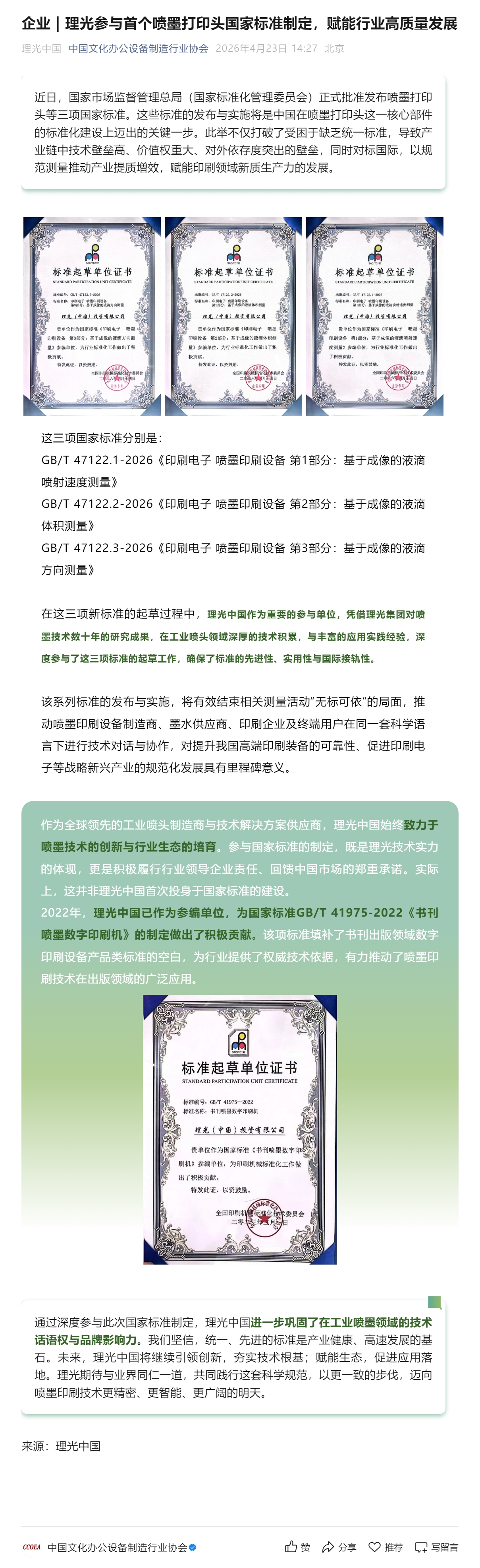 理光参与首个喷墨打印头国家标准制定,赋能行业高质量发展