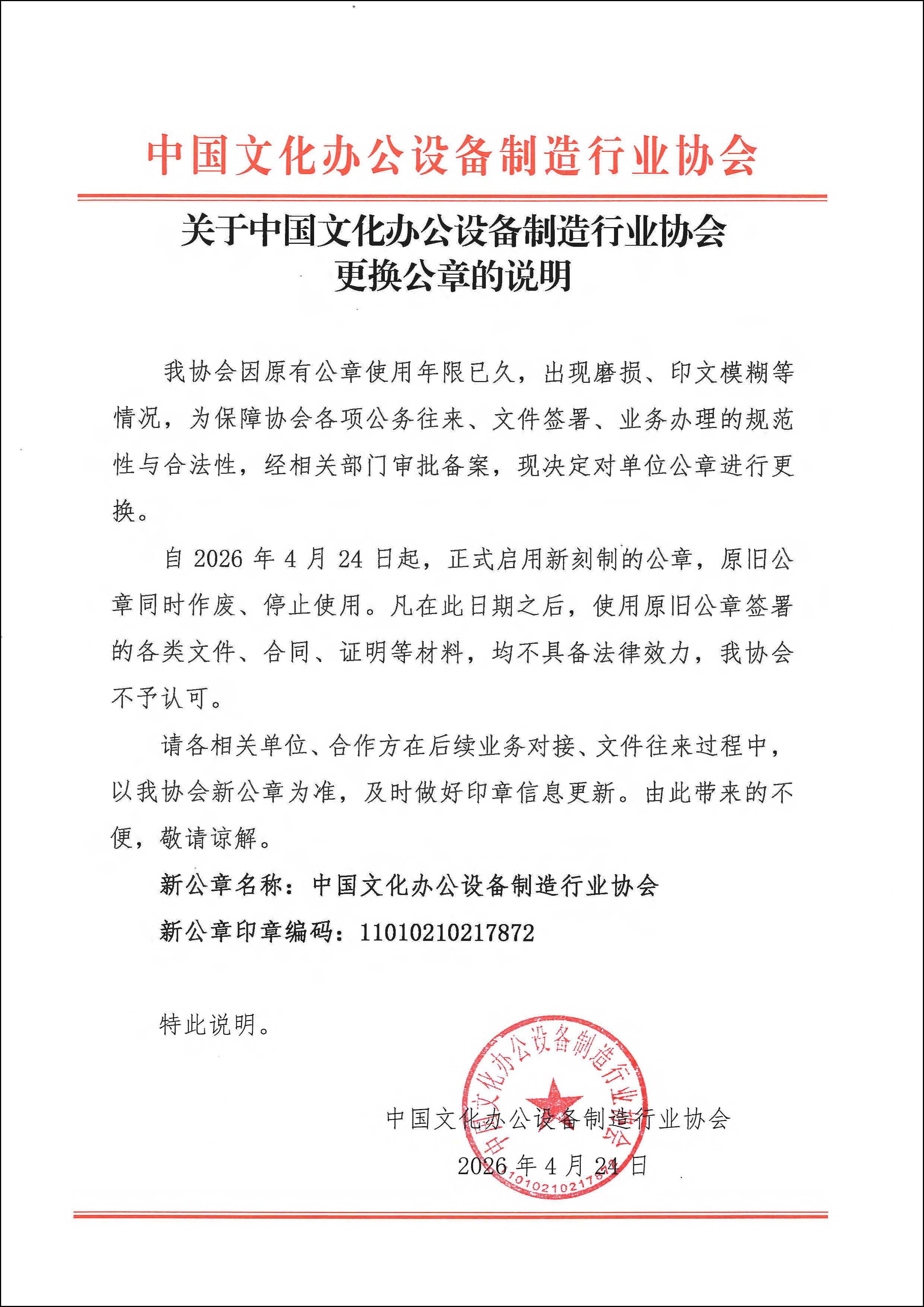 >> 通知 关于中国文化办公设备制造行业协会更换公章的说明